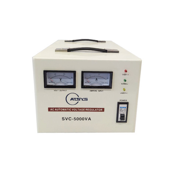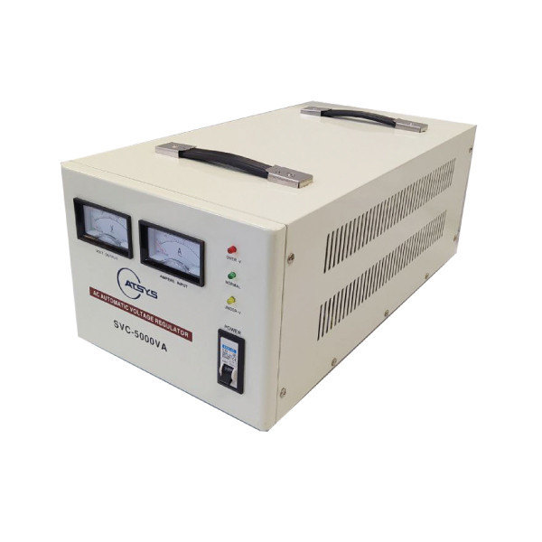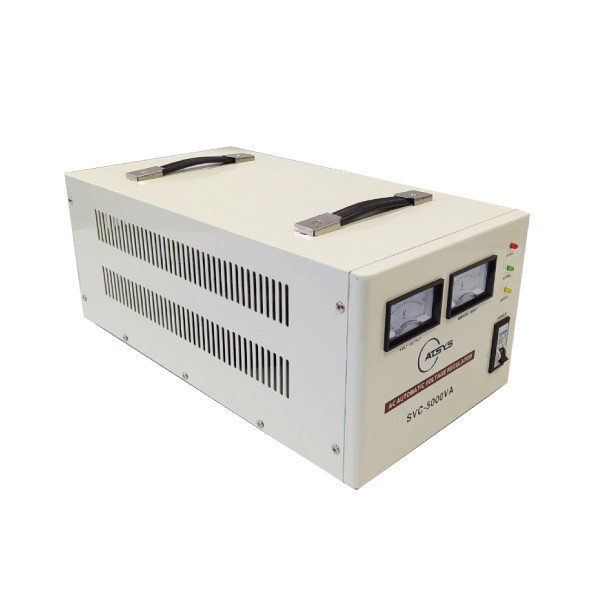 دستگاه استابلایزر به توان 5000ولت آمپر برند اتسیس مدل ASVC5000VA ،ورودی و خروجی تک فاز 220 ولت با تثبیت 3% و پذیرش ولتاژ ورودی 25% ، دارای تکنولوژی سروو موتور دارای ولت متر و آمپرمتر عقربه ای